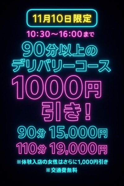11月10日 10:30-16:00限定90分以上のコースをご利用のお客様1000円割引します!90分15,000円110分19,000円体験入店割の女性はさらに割引90分14,000円110分18,000円宜しくお願いします♪